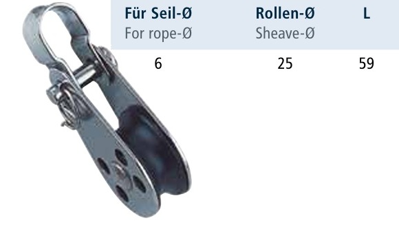 Bloczek mini z szeklą o średnicy wewnętrznej 10 mm na linę o max. grubości 6 mm z plastikową rolką średnicy 25 mm.