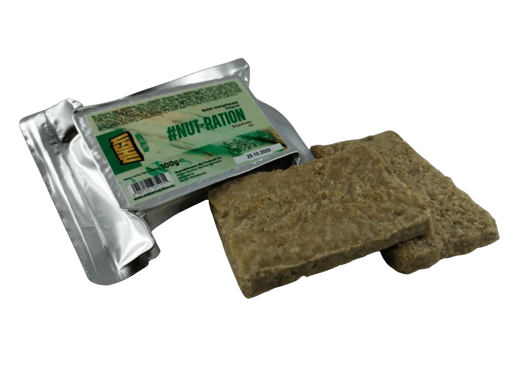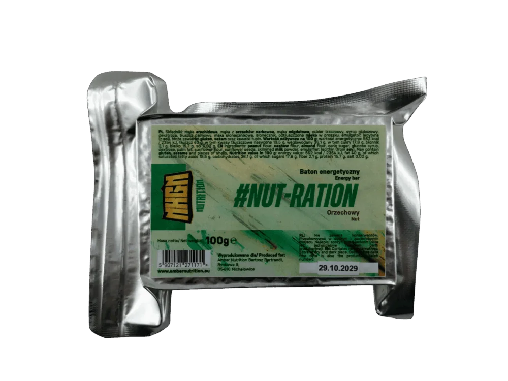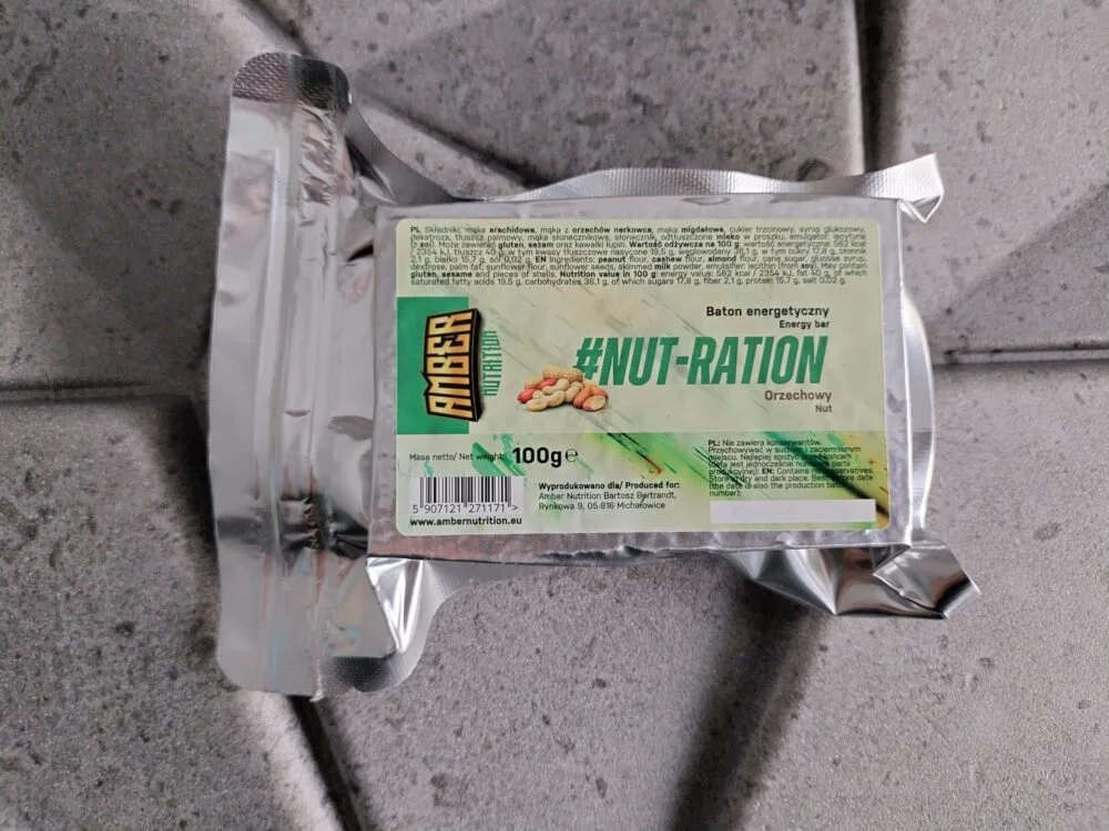 Baton #NUT-RATION, którego podstawą są mąki wytworzone z orzechów.