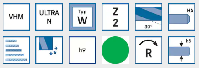 | Grupy materiałowe dla wartości cięcia | Opis dotyczący DIN | Klasa wytrzymałości [N/mm²] | Nr materiału | Vc [m/min] | fz [mm/T] przy średnicy | Przydatność |