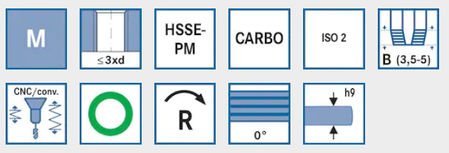 | Grupy materiałowe dla wartości cięcia | Opis dotyczący DIN | Klasa wytrzymałości [N/mm²] | Nr materiału | Vc [m/min] | f [mm/r] dla średnicy | Przydatność |