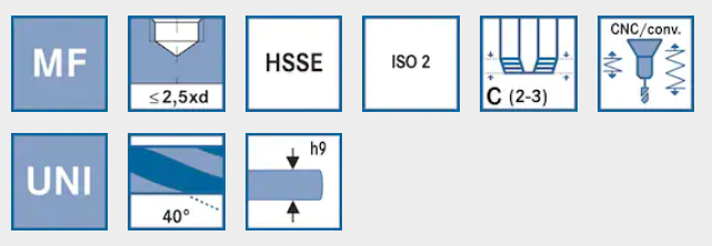 Do wykonywania drobnych gwintów metrycznych w otworach nieprzelotowych na maszynach CNC i konwencjonalnych w następujących grupach materiałów: stal, stal nierdzewna, metale nieżelazne i odlewy o wytrzymałości do 1000 N/mm².