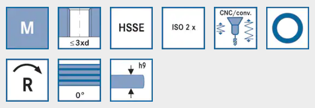 Do obróbki gwintów metrycznych (przycinania nakrętek i wypełniania otworów) w otworach przelotowych na maszynach CNC i konwencjonalnych, w stali, (stali nierdzewnej), metalach nieżelaznych i (odlewach), do 1000 N/mm².