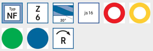 | Grupy materiałowe dla wartości cięcia | Opis dotyczący DIN | Klasa wytrzymałości [N/mm²] | Nr materiału | Vc [m/min] | fz [mm/T] przy średnicy | Przydatność |