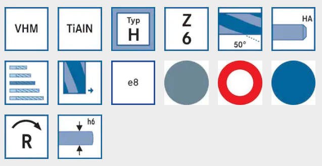 | Grupy materiałowe dla wartości cięcia | Opis dotyczący DIN | Klasa wytrzymałości [N/mm²] | Nr materiału | Vc [m/min] | fz [mm/T] przy średnicy | Przydatność |