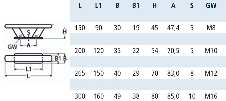 KNAGA 8680 TRAPEZOWA Z GWINTEM WEW M16 INOX A4 300 MM
