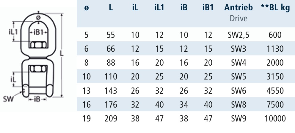 Krętlik RVS oko-szekla M19 ze sworzniem na klucz ampulowy.