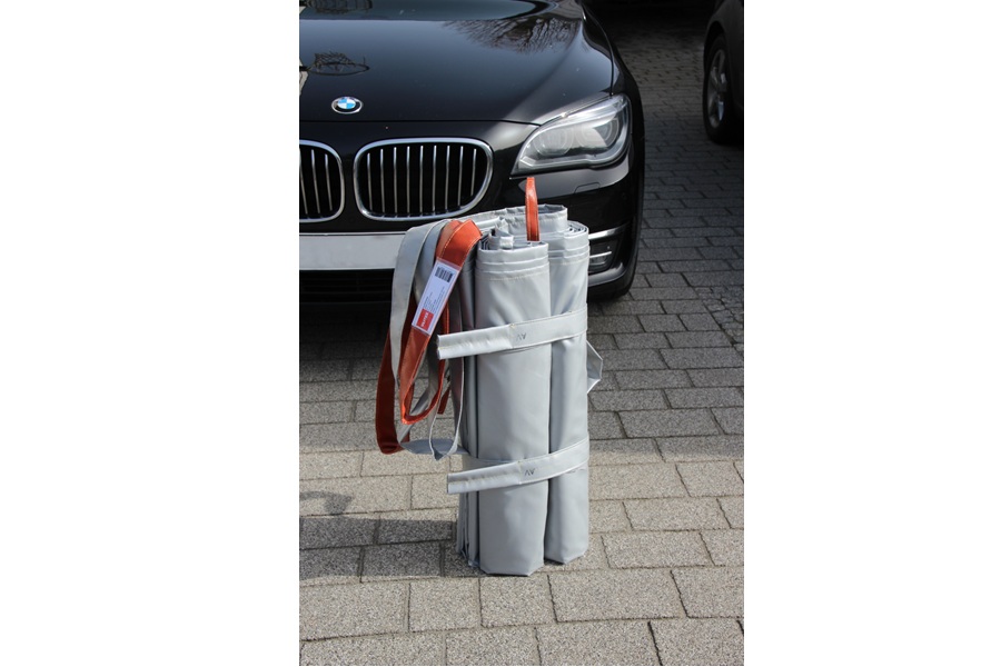 - spełnia wymagania normy DIN SPEC 91489 - pierwszej i jedynej na świecie oficjalnej normy, która wprost reguluje wymagania dla koców przeciwpożarowych stosowanych przy pożarach pojazdów elektrycznych (EV), w tym zdarzeń z udziałem baterii litowo-jonowych.