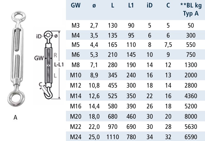 Śruba rzymska w całości wykonana ze stali kwasoodpornej (A4-316).