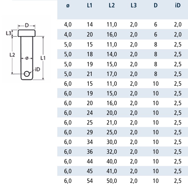 Dokładne wymiary oraz dostępne rozmiary sworzni przedstawione są w tabeli na zdjęciu NR 2.