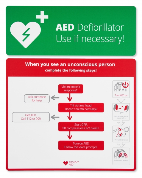 Tablica z algorytmem postępowania przy reanimacji z AED. Wykonana z materiału odpornego na ścieranie i warunki atmosferyczne (spienione PCV). Grubość tablicy: 2 mm. Algorytm podzielony jest na 2 części ułatwiające oznaczenie miejsca instalacji AED. Część zielona o wymiarach 14 x 37 cm, część czerwona: 32 x 37 cm.