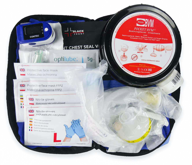 Moduł Drogi Oddechowe (D) to zestaw, z którym przeprowadzisz wentylację poszkodowanego z użyciem worka BVM, zabezpieczysz drogi oddechowe, rany klatki piersiowej oraz będziesz w stanie monitorować stan Pacjenta - skuteczność wentylacji - poziom wysycenia krwi tlenem (saturację).