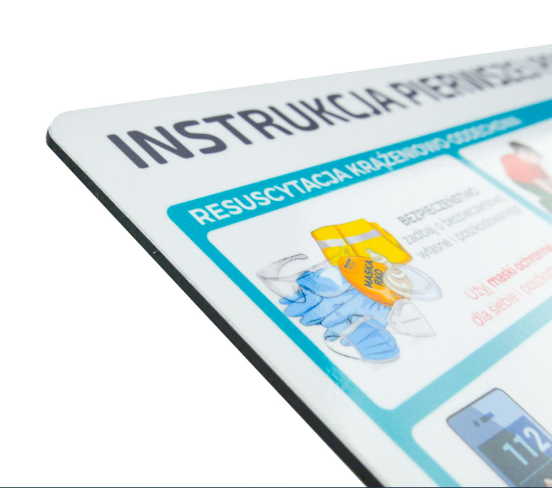 Prostokątna tablica z instrukcją udzielania pierwszej pomocy. Najważniejsze informacje zebrane w jednym miejscu, przedstawione w prosty i czytelny sposób.