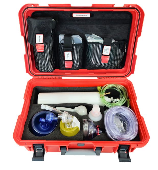Zestaw gromadzi cały sprzęt do zabezpieczenia dróg oddechowych w ramach procedur KPP m.in.: Butla tlenowa 2,7 l. z reduktorem, ssak, resuscytatory, maski i rurki, plus panel medyczny R1 z wyposażeniem.