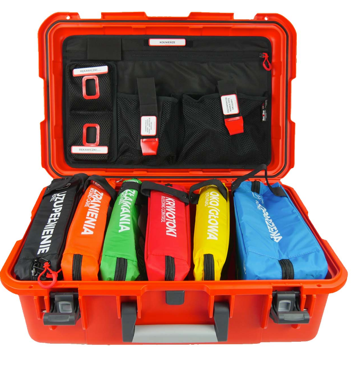 Załączone do walizki saszetki pozwalają na uporządkowanie wszystkich niezbędnych do opatrzenia danego rodzaju urazu akcesoriów. Dzięki nim całe wyposażenie rozmieszczone jest w odpowiednio podpisanym i oznaczonym miejscu, co ma na celu usprawnienie pracy medyka. Idealnie ułożone i posegregowane elementy znacznie ułatwiają udzielenie pomocy poszkodowanemu w czasie akcji ratowniczej.