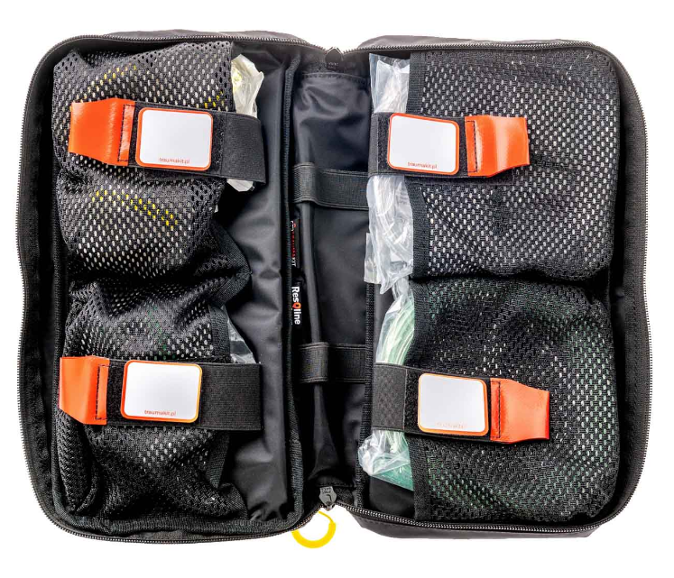 Elementy są posegregowane i idealnie ułożone, całość wyposażenia jest starannie opisana i oznaczona, dzięki czemu ratownicy mogą szybko znaleźć potrzebny sprzęt w czasie akcji. Narzepki umieszczone na kieszeniach wewnętrznych opisują dokładną ich zawartość, co pomaga utrzymać porządek oraz pozwala na jeszcze sprawniejsze działanie. Nawet Ci, którzy rzadko korzystają z zestawu R1, nie mają problemu ze sprawnym udzieleniem pomocy, ponieważ moduły są czytelnie opisane (także w środku) i mają różne kolory dedykowane konkretnym urazom. Warto również podkreślić, że modułowe rozwiązanie TRAUMAKIT PRO posiada unikalną konstrukcję, która umożliwia zabrać moduł z miejsca zdarzenia bez konieczności jego zamknięcia, a mimo to zachowuje pełną integralność zawartości. Dzięki temu, gdy ratownik potrzebuje konkretne narzędzie lub materiał z modułu, może bezpiecznie i szybko przenieść go, nie tracąc cennego czasu na ponowne zamykanie saszetki. Dzięki tym zaletom, modułowe rozwiązanie TRAUMAKIT PRO przyczynia się do efektywności i szybkości udzielania pomocy medycznej, co ma kluczowe znaczenie w sytuacjach ratunkowych.