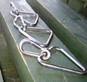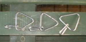 Produkt z drutu fi 5 o wymiarze boku 50 mm : trójkąt 50 z karabińczykiem .