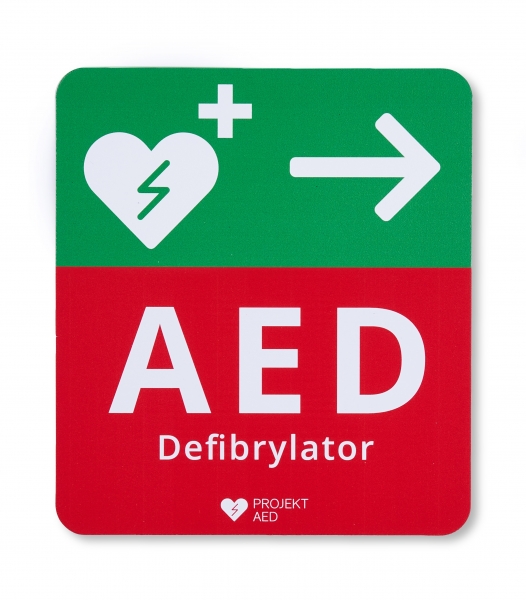 Tablica kierunkowa AED. Wykonana z materiału odpornego na ścieranie i warunki atmosferyczne (spienione PCV). Grubość tablicy: 2 mm. Duże logo, napis AED i strzałka informują o dostępnym defibrylatorze w danej lokalizacji. Tablica w kolorze zielono-czerwonym o wymiarach: 20 cm x 22,5 cm. Kierunek strzałki: w prawo