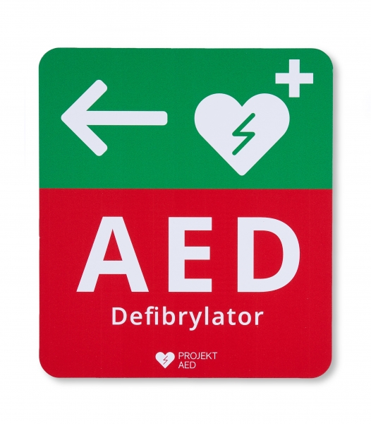 Tablica kierunkowa AED. Wykonana z materiału odpornego na ścieranie i warunki atmosferyczne (spienione PCV). Grubość tablicy: 2 mm. Duże logo, napis AED i strzałka informują o dostępnym defibrylatorze w danej lokalizacji. Tablica w kolorze zielono-czerwonym o wymiarach: 20 cm x 22,5 cm. Kierunek strzałki: w lewo