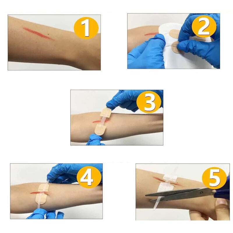 Pociągnij oba paski w poziomie, aż krawędzie rany zetkną się ze sobą. Nie ściskaj zbyt mocno – wystarczy, że rana będzie zamknięta.